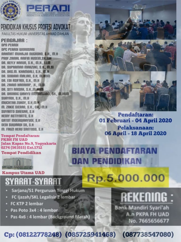 Fakultas Hukum Universitas Ahmad Dahlan Yogyakarta bekerjasama dengan Dewan Pimpinan Nasional Perhimpunan Advokat (PERADI) kembali membuka pendaftaran Pendidikan Khusus Profesi Advokat. Pendaftaran pendidikan khusus profesi advokat ini dibuka mulai tanggal 01 Februari – 04 April 2020. Pendidikan Khusus Profesi Advokat (PKPA) rencananya akan dilaksanakan pada tanggal 06 April – 18 April 2020 bertempat di Kampus Utama Universitas Ahmad Dahlan Yogyakarta. PKPA merupakan pendidikan yang harus ditempuh bagi lulusan fakultas hukum yang ingin berprofesi menjadi seorang advokat dengan syarat – syarat yang telah ditentukan dalam Undang – Undang Nomor 18 Tahun 2003 Tentang Advokat.