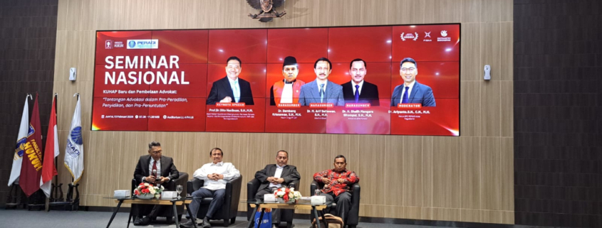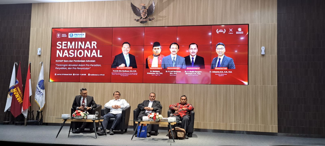 Seminar Nasional ini menghadirkan 3 (tiga) narasumber yang mengisi kegiatan ini yaitu Dr. Bambang Krisnawan, S.H., M.H. (Hakim Tinggi Pengadilan Tinggi Daerah Istimewa Yogyakarta), Dr. M. Arif Setiawan, S.H., M.H. (Advokat/Dosen), dan Dr. H. Shalih Mangara Sitompul, S.H., M.H. (Wakil Ketua DPN PERADI). Kegiatan ini menjadi forum yang strategis dalam membahas dinamika pembaruan hukum acara pidana, khususnya terkait KUHAP baru terhadap peran dan strategi pembelaan advokat dalam tahapan praperadilan, penyidikan, dan pra-penuntutan.